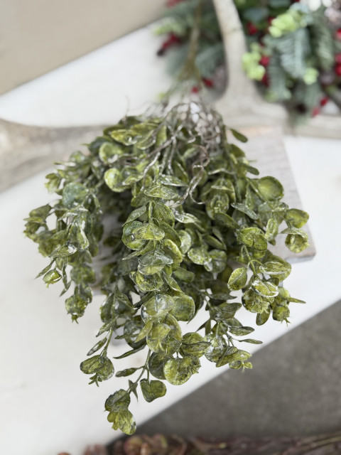 EUKALYPTUS, veľká kytica, 9x stonka, zelený jemne zasnežený vzhľad, 59cm
