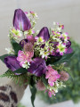 Bohatá dekoračná kytica tulipánov v jemnej fialovej melírovanej farbe, doplnená o kvitnúci kvet a dekoratívnu zeleň. Pôsobí sviežo, prirodzene a veľmi jarne.