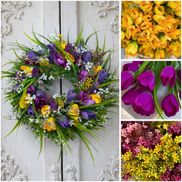 Veľká kytička krokusov v žiarivej oranžovej farbe. Bohato hustá, obsahuje 36 textilných kvetov, 18 plastových stoniek a jemné doplnky gypsomilky. Ideálna na jarné dekorácie, aranžovanie alebo do vencov.