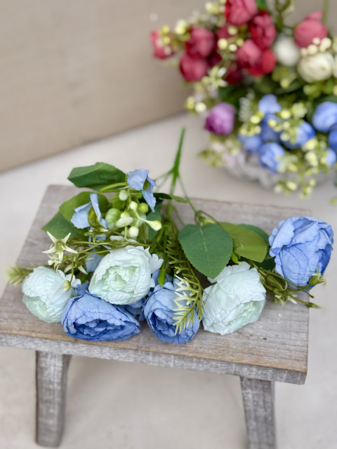 Jemná kytička ranunculus je krásnym doplnkom do jarných aj celoročných dekorácií. Menší kvet pôsobí prirodzene a ľahko sa kombinuje s inými aranžérskymi materiálmi. Hlavný kvet je textilný, listy sú taktiež textilné, jemne šušťavé, čo dodáva kytičke zaujímavú štruktúru. Doplnkový kvet je plastový, ľahký a vhodný na ďalšie spracovanie.