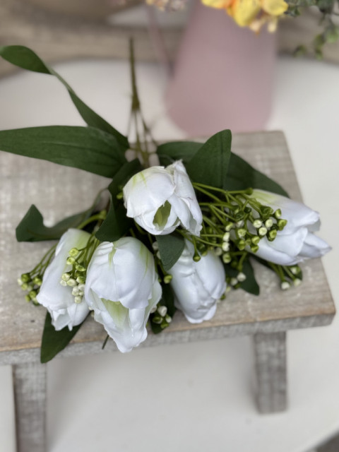 Kytička tulipánov s dekoratívnymi bobuľkami vyniká krásnym spracovaním a top kvalitou materiálov. Obsahuje 5 tulipánov, teda 5 stoniek, pričom stonky a bobuľky sú plastové, listy a kvety tulipánov textilné. Vďaka kombinácii materiálov pôsobí veľmi prirodzene a zároveň je odolná a praktická na aranžovanie.