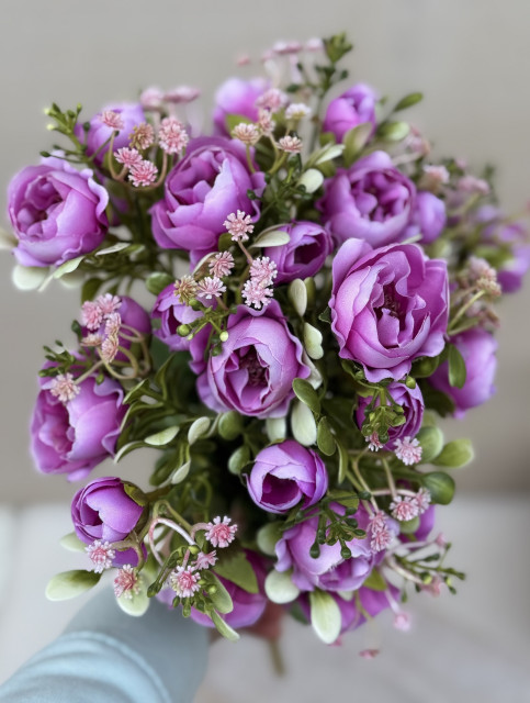Bohatá a elegantná Rarunculus kytička, ktorá na prvý pohľad zaujme svojím objemom a jemnými detailmi. Tvorí ju 14 pevných stoniek, doplnených o jemnú gypsomilku a dekoratívny doplnok, vďaka čomu pôsobí prirodzene, sviežo a veľmi dekoratívne.