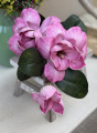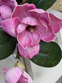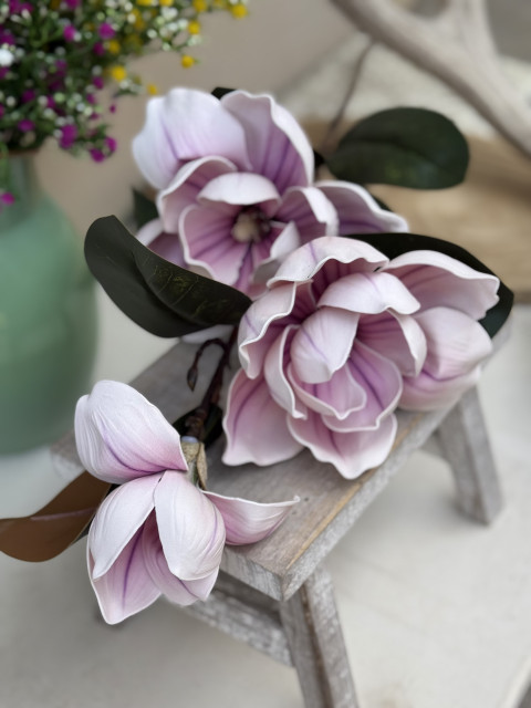 Elegantný dekoračný konár s magnóliou v prémiovej kvalite je krásnym doplnkom do moderných aj prírodných interiérov. Na dlhom konári sa nachádzajú tri výrazné kvety magnólie s veľkosťou približne 10 – 12 cm, ktoré pôsobia veľmi realisticky.