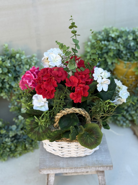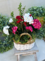 Elegantný biely prútený košík s bohatou kompozíciou muškátov, ktoré pôsobia ako živé. Kvety sú v troch farbách:ružová, červená a biela.