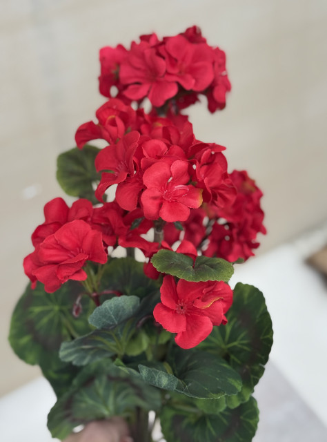 Muškáty sú citlivo doplnené o rozmarín a eukalyptus, čo aranžmánu dodáva prirodzenosť, jemnú zeleň a nádych luxusu. Celá dekorácia pôsobí sviežo, bohato a veľmi vkusne, presne ten detail, ktorý zútulní terasu, balkón či okenný parapet.