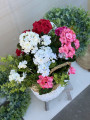 Elegantný biely prútený košík s bohatou kompozíciou muškátov, ktoré pôsobia ako živé. Kvety sú v troch farbách:ružová, červená a biela.