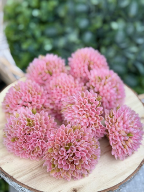 Bohatá stolná kytica s ružovými daliami a jemným doplnkom zelene, ktorá pôsobí elegantne a zároveň sviežo. Plné hlavy kvetov vytvárajú krásny objem a vyniknú samostatne vo váze aj ako súčasť väčšieho aranžmánu.