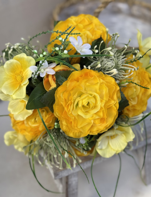 Bohatá a výrazná kytica s 15 starostlivo vybranými kvetmi je perfektným doplnkom do väčších dekorácií. V jej zložení nájdete rarunkulus, pivónku, cemericu, rôzne doplnky a trávu, ktoré spolu tvoria harmonickú a prirodzene pôsobiacu kompozíciu.