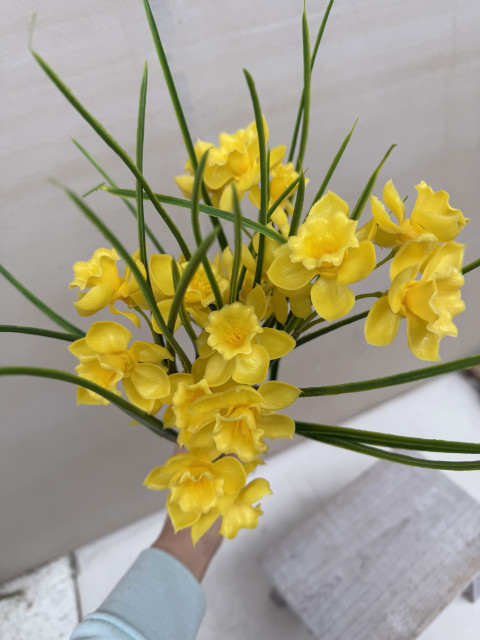 Bohatá kytička mini narcisov, ktorá okamžite prinesie do priestoru sviežu jarnú atmosféru. Kvety sú vyrobené z kvalitného gumového materiálu, vďaka čomu pôsobia veľmi realisticky na pohľad aj na dotyk. Dlhé plastové lístky krásne dopĺňajú celkový vzhľad a dodávajú aranžmánu prirodzený objem.