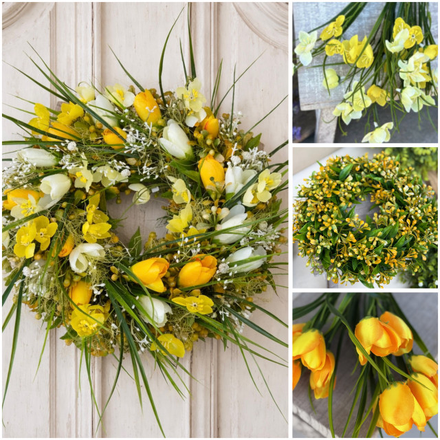 V balení nájdete vencový plastový veľkosti 30 cm, pestrofarebné textilné kvety, dlhé plastové lístky, gypsomilku, trávu a drobné doplnky, ktoré spolu krásne ladia a vytvárajú svieži jarný efekt.