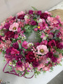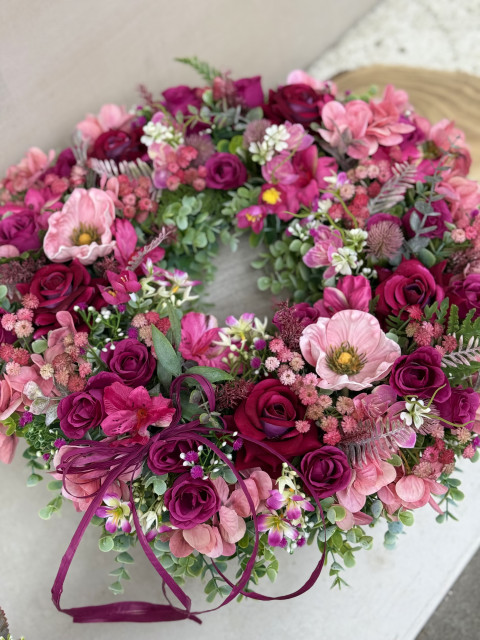 Tento bohato zdobený veniec je výsledkom precíznej ručnej práce, tvorenej s láskou a dôrazom na detail. Každý lístok, kvietok či vetvička má svoje miesto, nič nie je náhodné, všetko ladí.
