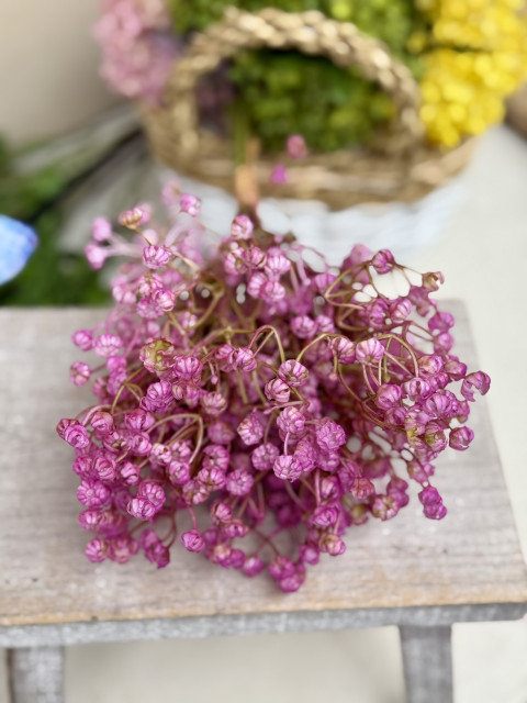 Krásny zväzok gipsomilky je hustý, sýto farebný a pôsobí veľmi prirodzene, vďaka čomu je ideálnym doplnkom do jarných aj celoročných dekorácií. Menšie kvietky v hustej väzbe vytvárajú pocit plnosti a elegancie, pričom zachovávajú jemnosť a ľahkosť typickú pre gypsomilku.