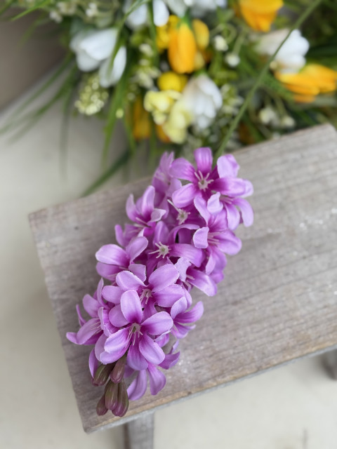 Hyacint– jarný záblesk, ktorý rozžiari každú dekoráciu. Jemný textilný kvet pôsobí prirodzene a vďaka detailnému spracovaniu vyzerá krásne aj zblízka. Celková dĺžka stonky je 50 cm, samotný kvet má 15 cm, takže v aranžmáne pekne vynikne a dodá mu výšku aj ľahkosť. Ideálny do jarných dekorácií, vencov, kvetinových aranžmánov aj len tak do vázy, keď chceš do priestoru priniesť pocit jari bez starostí.