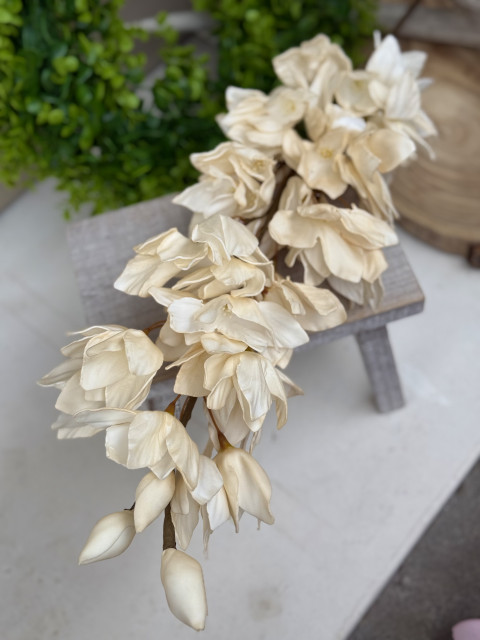 Kvety sú precízne spracované, detailne tieňované a pôsobia veľmi realisticky. Na prvý pohľad zaujmú svojou plnosťou a jemnými prechodmi farieb. Vďaka dĺžke približne 90 cm je konár ideálny do vysokých váz, kde krásne vynikne ako solitér, ale rovnako sa hodí aj do veľkých aranžmánov či vencov na vnútorné použitie.