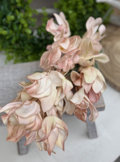 Kvety sú precízne spracované, detailne tieňované a pôsobia veľmi realisticky. Na prvý pohľad zaujmú svojou plnosťou a jemnými prechodmi farieb. Vďaka dĺžke približne 90 cm je konár ideálny do vysokých váz, kde krásne vynikne ako solitér, ale rovnako sa hodí aj do veľkých aranžmánov či vencov na vnútorné použitie.