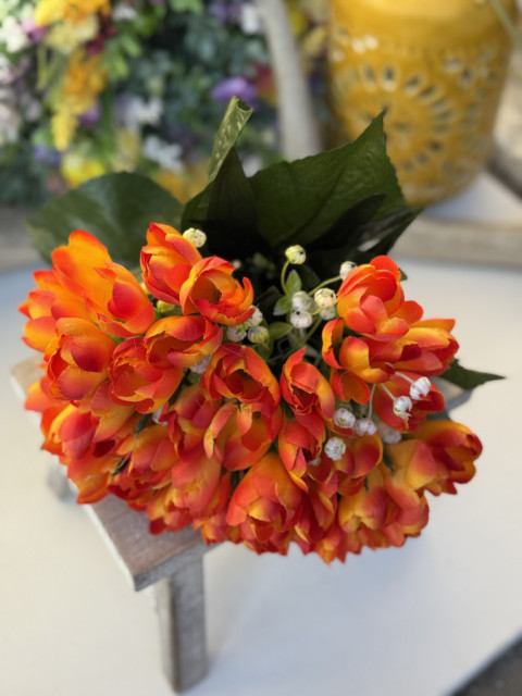 Veľká kytička krokusov v žiarivej oranžovej farbe. Bohato hustá, obsahuje 36 textilných kvetov, 18 plastových stoniek a jemné doplnky gypsomilky. Ideálna na jarné dekorácie, aranžovanie alebo do vencov.