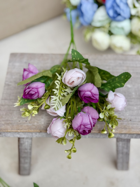 Jemná kytička s minipivonkou je ideálnym doplnkom do jarných aj celoročných dekorácií. Menší kviet pôsobí nežne a prirodzene, vďaka čomu sa krásne kombinuje s inými materiálmi a aranžmánmi. Kvety sú textilné, listy taktiež textilné, jemne šušťavé, čo dodáva kytičke zaujímavú štruktúru. Doplnok je plastový, ľahký a praktický na ďalšie spracovanie.