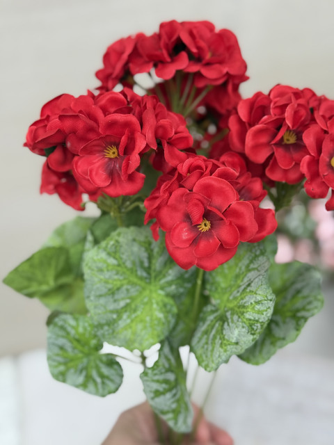 Krásna a mimoriadne realistická kytička Muškátu, ktorá na nerozoznanie pripomína živú rastlinu. Kvety aj listy sú vyrobené z kvalitného textilu, precízne prepracované do posledného detailu, vďaka čomu pôsobia prirodzene a sviežo. Stonka je plastová, pevná a vhodná na ďalšie aranžovanie.