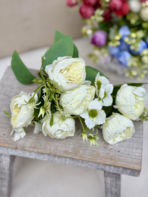 Jemná kytička ranunculus je krásnym doplnkom do jarných aj celoročných dekorácií. Menší kvet pôsobí prirodzene a ľahko sa kombinuje s inými aranžérskymi materiálmi. Hlavný kvet je textilný, listy sú taktiež textilné, jemne šušťavé, čo dodáva kytičke zaujímavú štruktúru. Doplnkový kvet je plastový, ľahký a vhodný na ďalšie spracovanie.