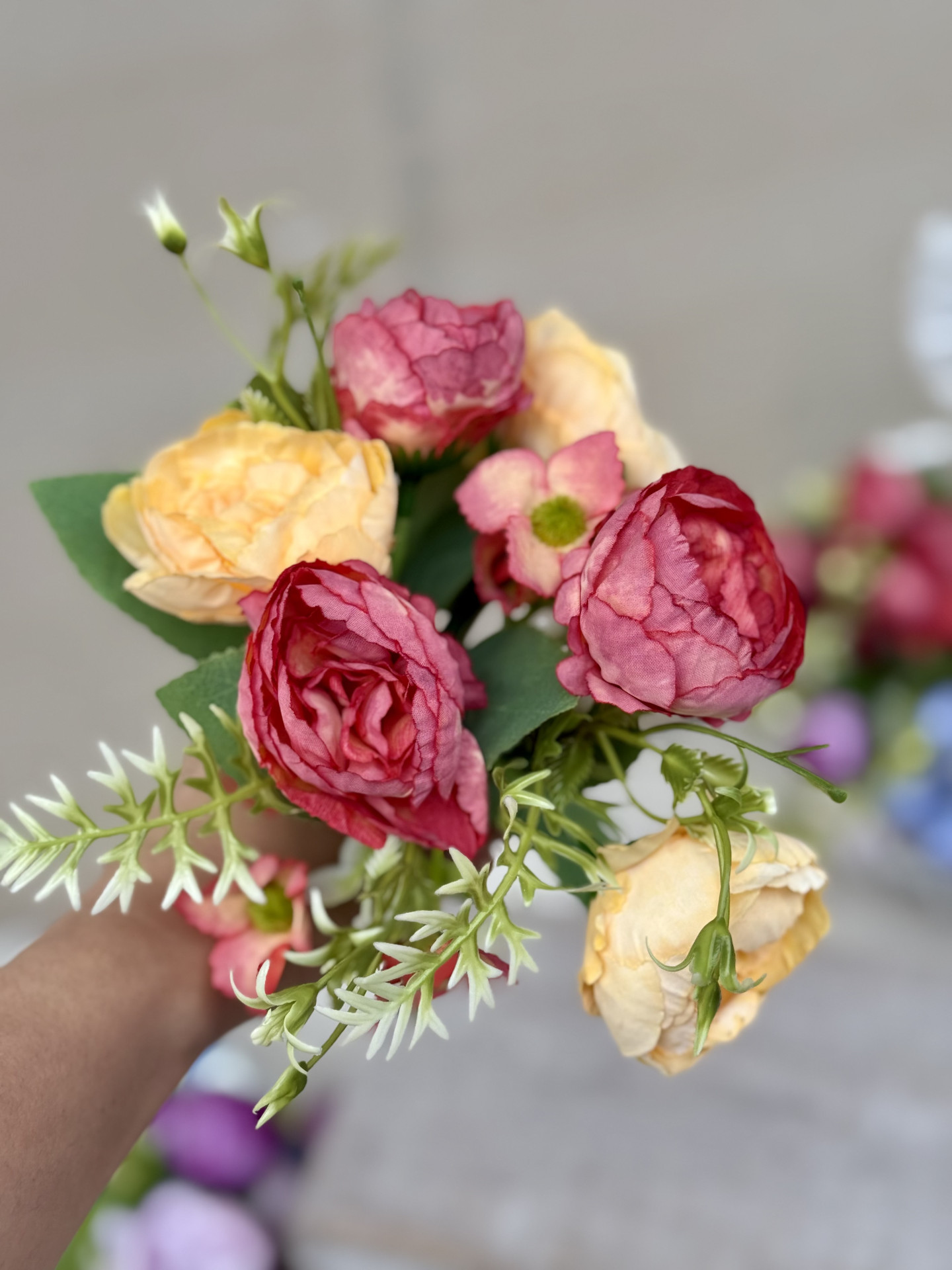 Jemná kytička ranunculus je krásnym doplnkom do jarných aj celoročných dekorácií. Menší kvet pôsobí prirodzene a ľahko sa kombinuje s inými aranžérskymi materiálmi. Hlavný kvet je textilný, listy sú taktiež textilné, jemne šušťavé, čo dodáva kytičke zaujímavú štruktúru. Doplnkový kvet je plastový, ľahký a vhodný na ďalšie spracovanie.