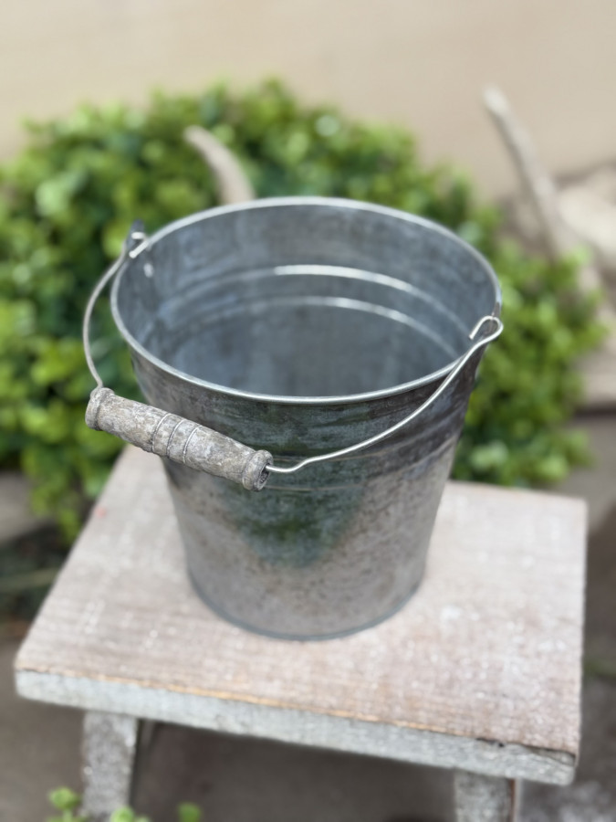 Plechové vedierko s drevenou rúčkou je malý, ale veľmi vďačný základ pre jarné dekorovanie.