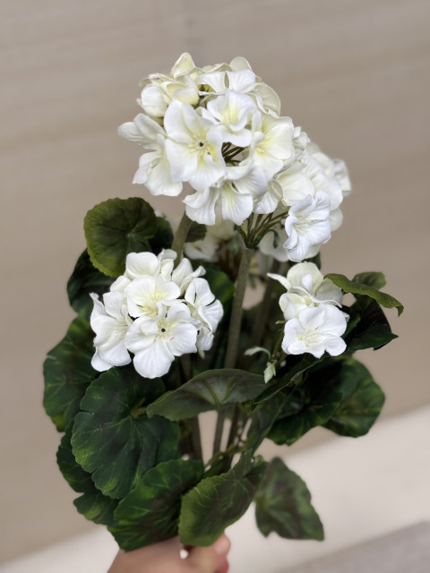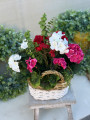 Elegantný biely prútený košík s bohatou kompozíciou muškátov, ktoré pôsobia ako živé. Kvety sú v troch farbách:ružová, červená a biela.