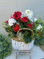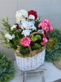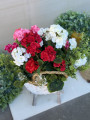 Elegantný biely prútený košík s bohatou kompozíciou muškátov, ktoré pôsobia ako živé. Kvety sú v troch farbách:ružová, červená a biela.