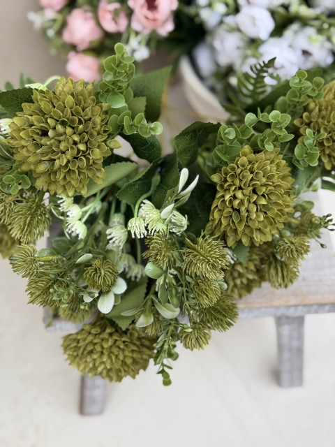 Kytica obsahuje 12 stoniek a kombinuje rôzne materiály: plastové kvety a bodliaky, textilné listy, doplnkovú zeleň a nechýba ani eukalyptus, ktorý dodáva moderný a prirodzený vzhľad. Spracovanie je kvalitné, kvety si držia tvar a farbu bez potreby údržby.