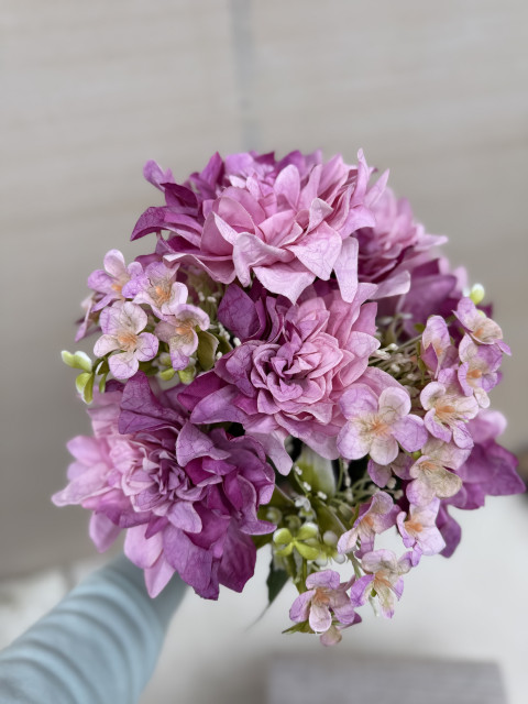Bohatá stolná kytica s ružovými daliami a jemným doplnkom zelene, ktorá pôsobí elegantne a zároveň sviežo. Plné hlavy kvetov vytvárajú krásny objem a vyniknú samostatne vo váze aj ako súčasť väčšieho aranžmánu.